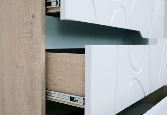 Комод – 4 ящика.) Корпус: дуб ирландский Фасад: МДФ белый матовый, серо-голубой, с фрезеровкой. Шариковые направляющие обеспечивают легкое движение ящиков. Габариты: Ш-900мм, Г-500мм, В- 925мм